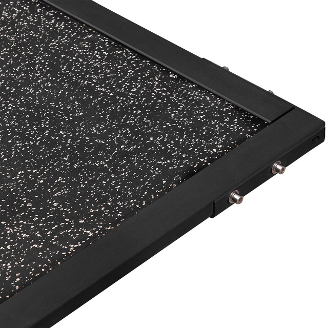 De constructie combineert staal, rubber en hout voor maximale duurzaamheid, demping en antislip. Het stalen frame zorgt voor stabiliteit zonder vervorming, de rubberlaag absorbeert schokken en vermindert geluid, en het houten oppervlak geeft een elegante, natuurlijke uitstraling die in elke ruimte past.